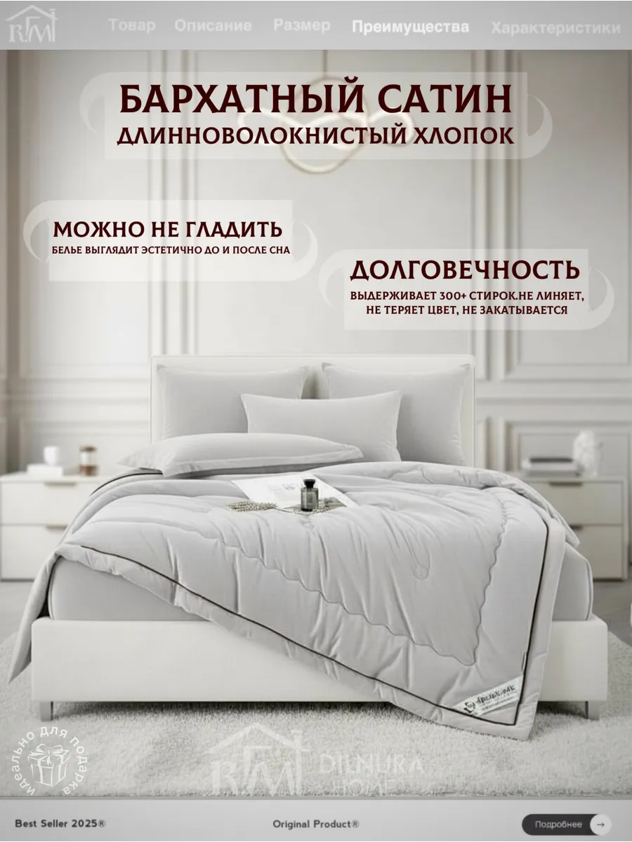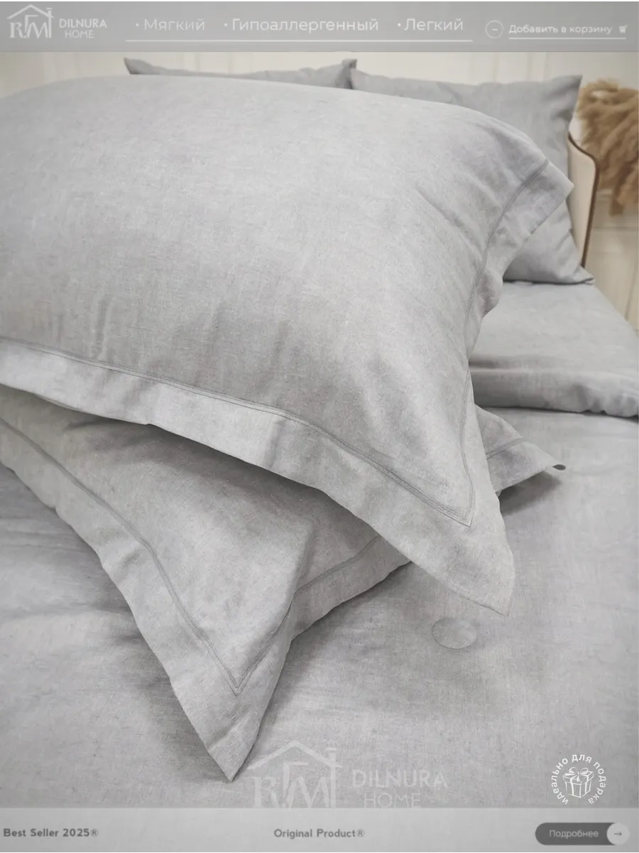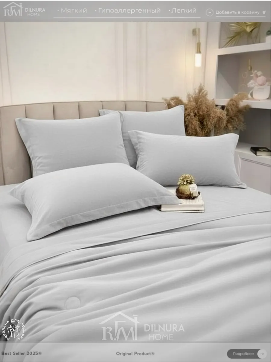 Такой набор — готовое решение для оформления спальни в едином стиле. Однотонная палитра гармонично смотрится в современном интерьере, а продуманная ткань остаётся мягкой, гладкой и устойчивой к износу даже после многочисленных стирок.